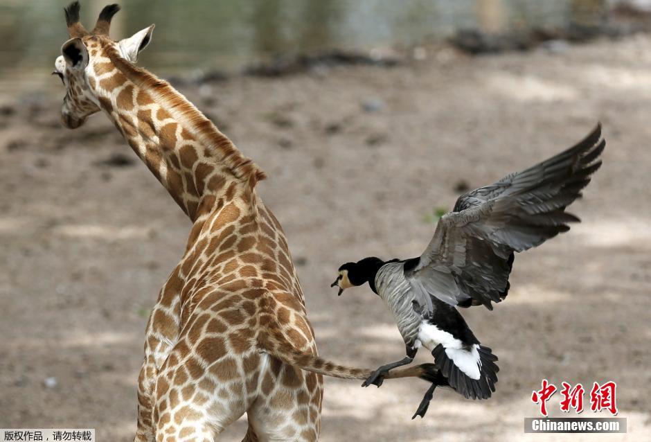 幼年长颈鹿遭鹅“嚣张”欺负 甩尾还击