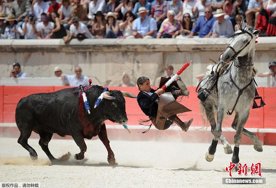 法国女斗牛士被牛顶翻 满脸笑容活割牛耳