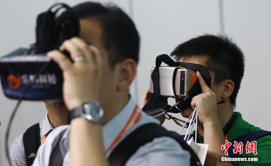 5月25日,首届CES亚洲消费电子展(CES Aisa)在上海开幕,这是在拉斯维加斯举办的美国CES展会首次来到亚洲,图为两名观众尝试虚拟现实游戏。CES Asia会议议程涵盖可穿戴设备、数字健康、机器人、物联网和未来消费技术市场等主题。展览展区总面积为2万多平方米,容纳大约200位参展商。中新社发 张浩 摄