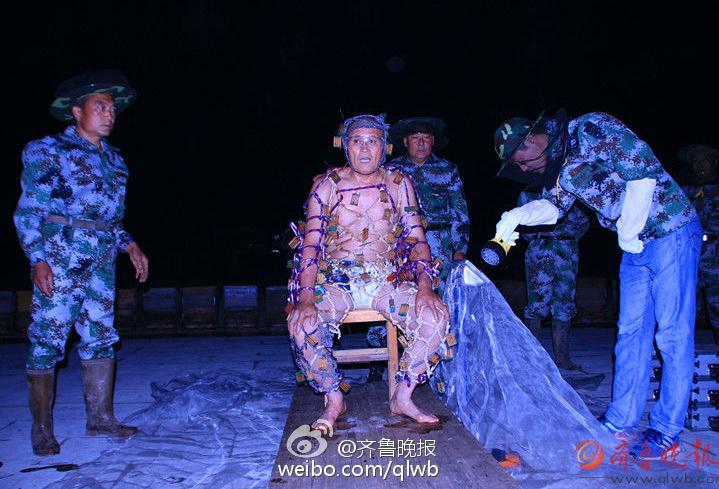 据齐鲁晚报官方微博5月25日报道,25日凌晨,“泰山蜂王”高丙国在接受上百万只蜜蜂蛰身,再次挑战世界吉尼斯纪录并成功。这套“蜂衣”重109.05公斤,每公斤有万只蜜蜂,打破85.5公斤的世界记录。高丙国全身多处被蛰伤,挑战成功后体温高达六七十度。(齐鲁晚报 刘红杰 图片来源:齐鲁晚报官方微博)