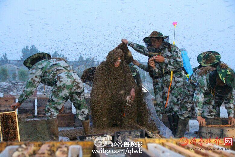 据齐鲁晚报官方微博5月25日报道,25日凌晨,“泰山蜂王”高丙国在接受上百万只蜜蜂蛰身,再次挑战世界吉尼斯纪录并成功。这套“蜂衣”重109.05公斤,每公斤有万只蜜蜂,打破85.5公斤的世界记录。高丙国全身多处被蛰伤,挑战成功后体温高达六七十度。(齐鲁晚报 刘红杰 图片来源:齐鲁晚报官方微博)