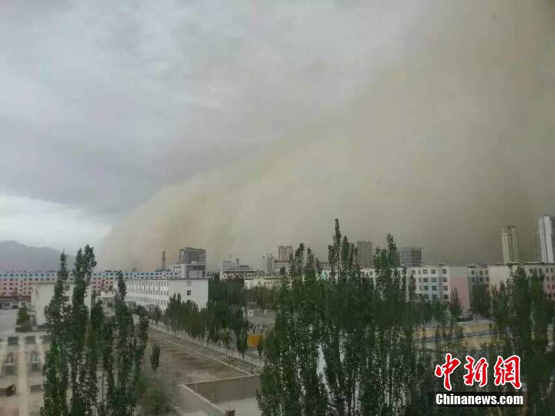 5月25日16时许,青海省海西州格尔木市境内刮起8级大风引发沙尘暴。据气象部门统计,瞬时风速达17.9m/s,整个市区被沙尘“吞没”,遮天蔽日犹如大片。图为沙尘暴“吞没”格尔木市区场景。钟欣 摄