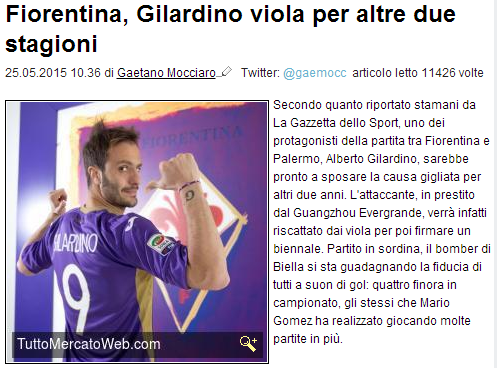 尽管只是中途加盟球队,但吉拉的能力还是得到了俱乐部上下,尤其是主帅蒙特拉的认可。要知道,德国球星戈麦斯整个赛季的联赛进球才不过4粒。鉴于吉拉如此出色的表现,佛罗伦萨高层已决意启动买断条款。按照此前与恒大达成的协议,紫百合将支付150万欧元的买断费,而在买断后,佛罗伦萨将与吉拉续约2年。
