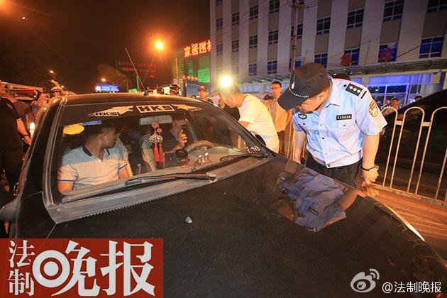 5月21日晚,执法人员在北京十里河地铁站附近检查一辆疑似“黑车”时,司机锁车拒检,执法车辆前后拦截后该车还有冲撞行为。8点半左右,劝说无果,执法人员持锤果断破窗控制住司机,初步调查该车为非法运营的“黑车”。 谢璐 付丁 摄 图片来源:法制晚报官微