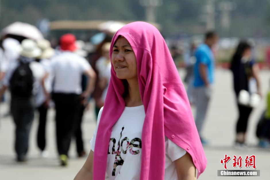 5月22日,两名在天安门广场游览的游客头顶一件外套遮阳防晒。据气象部门预计,由于近日没有明显冷空气影响,北京的气温将稳步上扬,本周日向35℃高温天气冲击。未来一周内,北京有望正式入夏。 中新社发 李慧思 摄