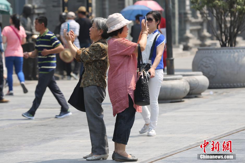 5月25日,游客在北京前门大街拍照留影。当日,北京发布今夏首个高温预警,午后户外温度高达35度。中新社发 熊然 摄