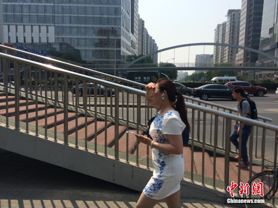2015年5月25日,在今年首个高温蓝色预警信号的笼罩下,京城开启烧烤模式,市民出行防晒“各显神通”。中新网记者 翟璐 摄