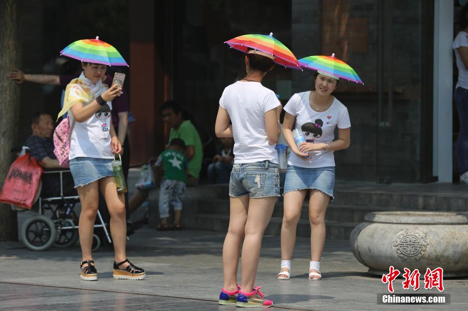 5月25日,游客头顶遮阳伞在北京前门大街行走。当日,北京发布今夏首个高温预警,午后户外温度高达35度。中新社发 熊然 摄