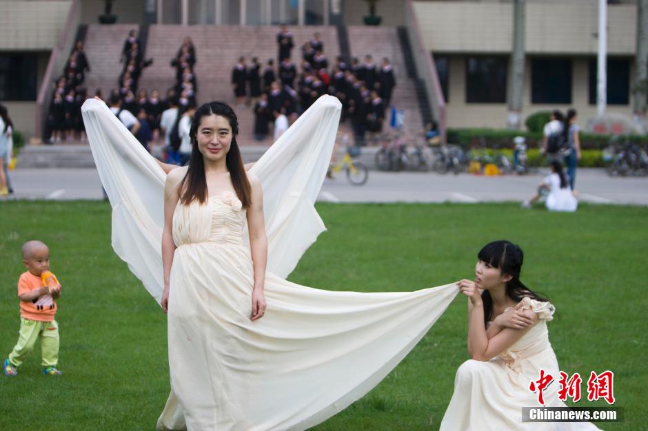 5月24日,山西太原,即将毕业的高校生在校园内拍摄创意写真。随着一年一度的毕业季的到来,中国各地高校的毕业们也将离开大学校园,为了给这段校园的青春岁月留下美好回忆,不少大学生在校园内拍摄各种“毕业写真”,以此纪念自己这段大学时光。中新社发 张云 摄