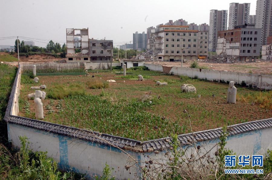 围墙内的明第十代秦王——宣王朱怀埢墓前神道周围被村民种上了农作物(5月26日摄)。位于西安长安区的全国重点文物保护单位明秦王陵园,近年来因缺乏监管和保护,陵园重点保护区内的部分秦王墓前神道周围被当地村民开垦成菜地,种上了大葱、黄瓜和辣椒等农作物,使这座昔日的皇家陵园变成了菜园。明秦王陵园为明13代秦藩王家族墓地,埋葬着明240年间镇守西安府的13位秦王,其墓葬前神道两旁至今保存有精美的华表、石蹲虎、石羊、石麒麟、石马、石人、石狮等大型石雕18件。2006年5月25日被公布为第六批全国重点文物保护单位。新华社记者都红刚摄