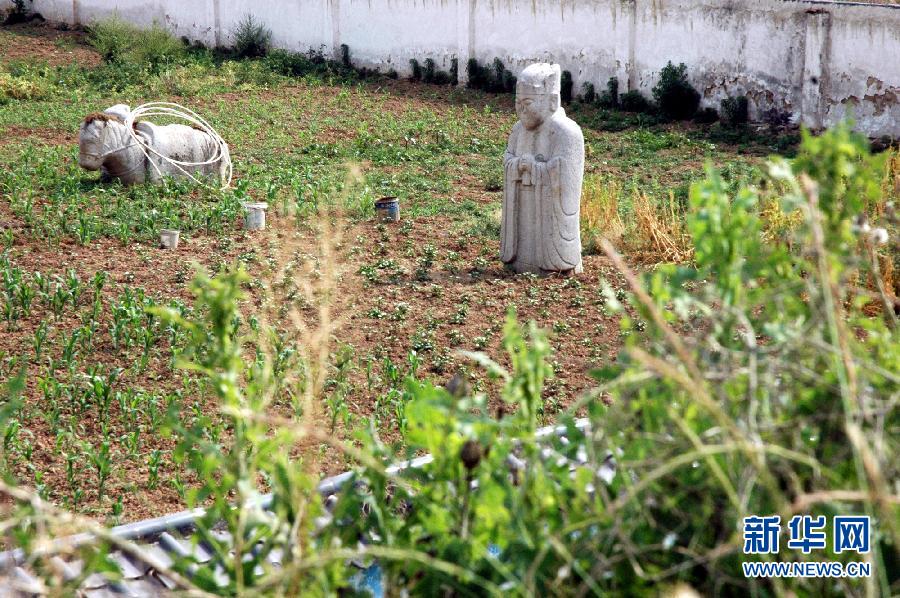 围墙内的明第十代秦王——宣王朱怀埢墓前神道周围被村民种上了农作物(5月26日摄)。位于西安长安区的全国重点文物保护单位明秦王陵园,近年来因缺乏监管和保护,陵园重点保护区内的部分秦王墓前神道周围被当地村民开垦成菜地,种上了大葱、黄瓜和辣椒等农作物,使这座昔日的皇家陵园变成了菜园。明秦王陵园为明13代秦藩王家族墓地,埋葬着明240年间镇守西安府的13位秦王,其墓葬前神道两旁至今保存有精美的华表、石蹲虎、石羊、石麒麟、石马、石人、石狮等大型石雕18件。2006年5月25日被公布为第六批全国重点文物保护单位。新华社记者都红刚摄