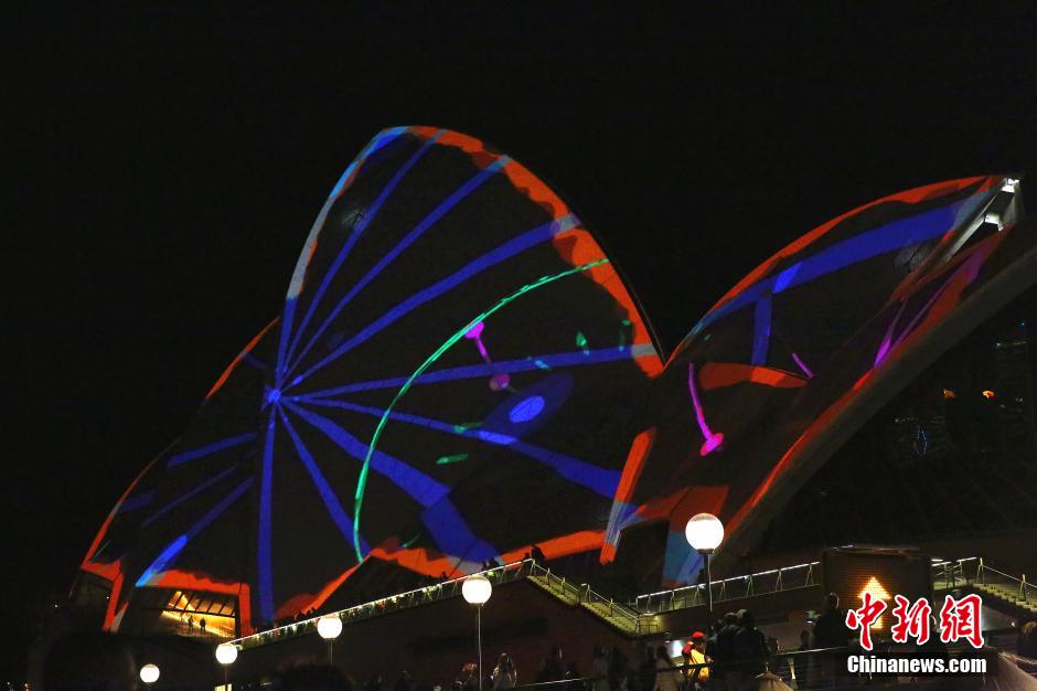 5月27日,澳大利亚悉尼歌剧院在在灯光秀中展示梦幻般的图案。悉尼灯光艺术节从本月22日正式开幕,将一直持续到下月8日结束。中新社发 赖海隆 摄