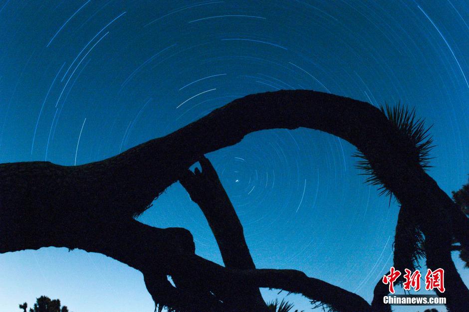 5月25日,在美国洛杉矶以东的约书亚树国家公园,摄影师用长时间曝光拍摄到的星轨。中新社发 林戈 摄