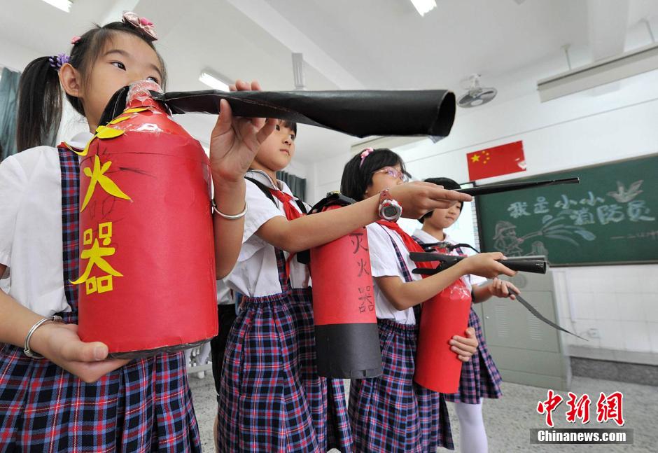 5月26日,福州市“零犯罪学校”创建活动现场会在福州仓山区第五中心小学举行。学校通过法制教育主题队会、班会的形式,开展普法知识竞赛、趣味游戏、安全知识培训等一系列活动,让同学们零距离接触法律、远离伤害、远离犯罪,在青少年当中树立良好的法制观念。图为小学生学习使用灭火器。张斌 摄