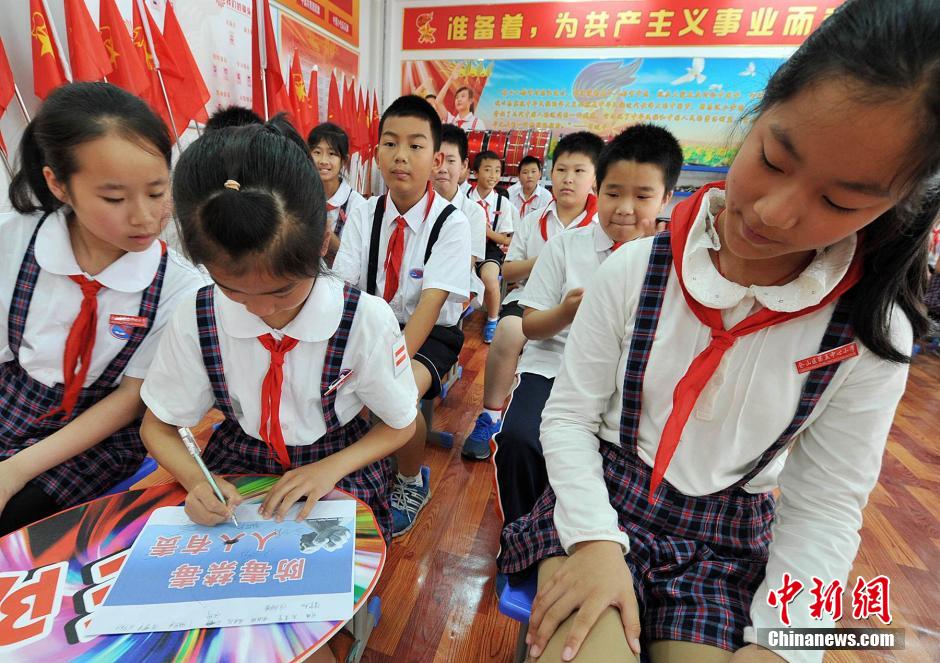 小学生在“防毒禁毒,人人有责”的标识上签名。张斌 摄