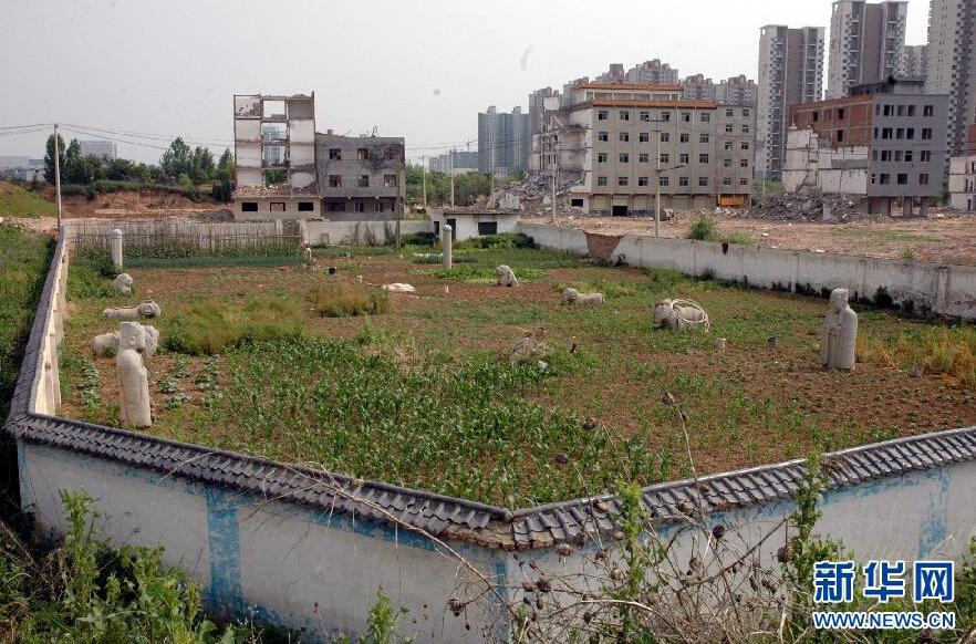 围墙内的明第十代秦王——宣王朱怀埢墓前神道周围被村民种上了农作物(5月26日摄)。位于西安长安区的全国重点文物保护单位明秦王陵园,近年来因缺乏监管和保护,陵园重点保护区内的部分秦王墓前神道周围被当地村民开垦成菜地,种上了大葱、黄瓜和辣椒等农作物,使这座昔日的皇家陵园变成了菜园。明秦王陵园为明13代秦藩王家族墓地,埋葬着明240年间镇守西安府的13位秦王,其墓葬前神道两旁至今保存有精美的华表、石蹲虎、石羊、石麒麟、石马、石人、石狮等大型石雕18件。2006年5月25日被公布为第六批全国重点文物保护单位。新华社记者 都红刚 摄 图片来源:新华网