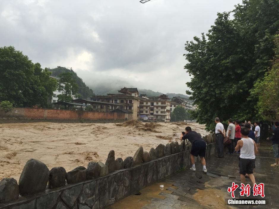 5月27日,贵州省雷山县因26日夜里暴雨侵袭,造成县城部分街道被洪水淹没。 中新社发 张祥祥 摄