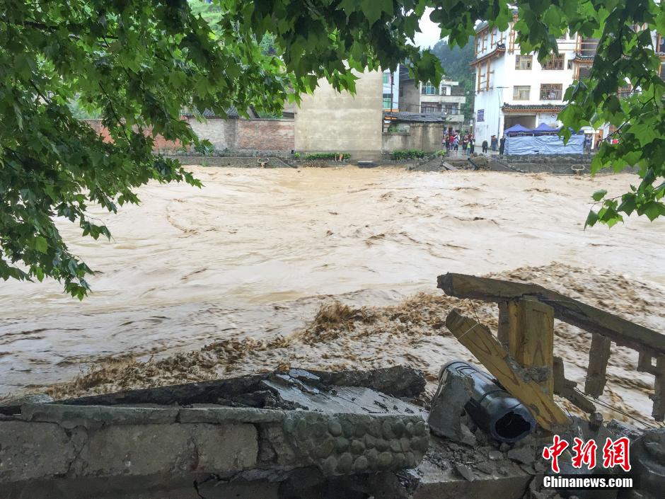 5月26日20时至27日7时,贵州180多个乡镇遭遇强降雨,其中雷山县大塘乡、桃江镇,榕江县平阳乡出现特大暴雨。图为雷山县城一座被洪水冲毁的桥。周娴 摄