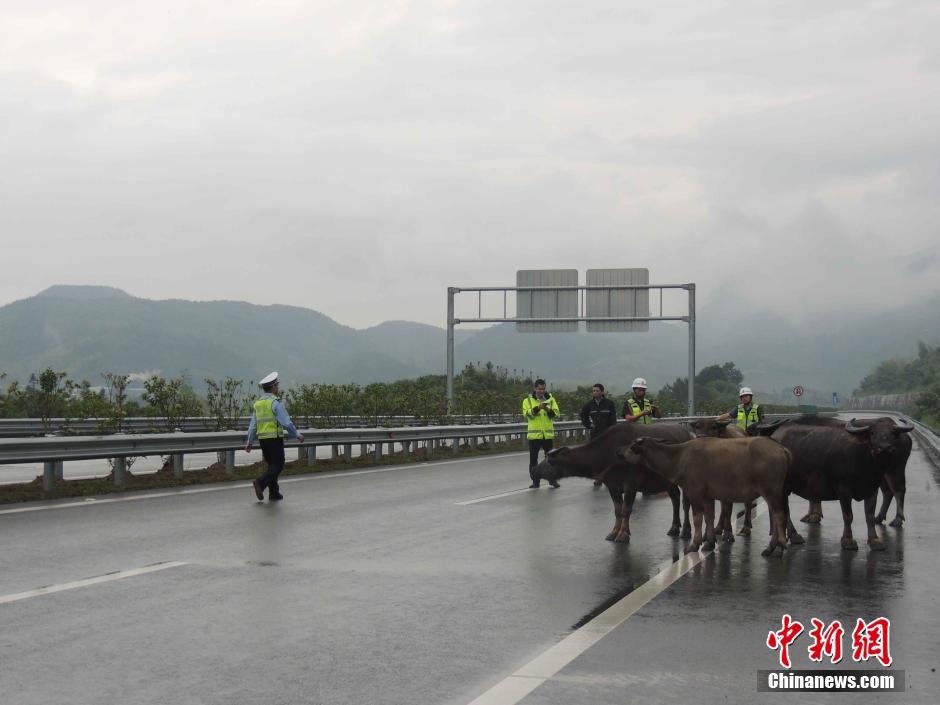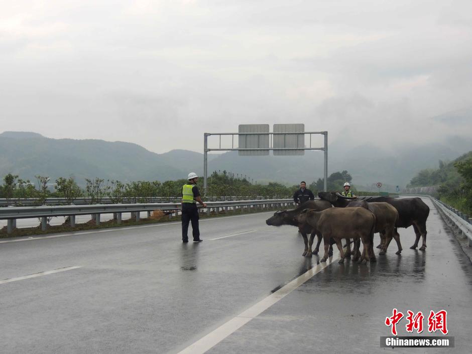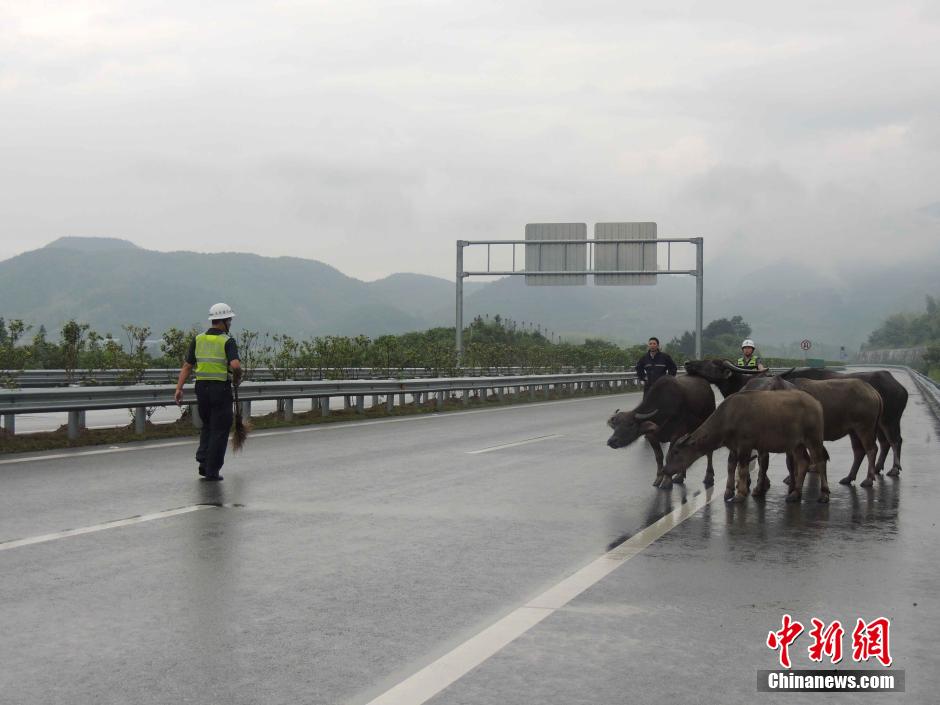 5月27日下午,在车辆飞驰的长深高速公路上(浙闽两个收费站中间),五头无绳牵绊的大水牛在高速公路上四处瞎晃,过往车辆纷纷避让,情形非常危险。接到报警后,浙江高速交警丽水五大队民警赶到现场,做起了跨省赶牛的“放牛娃”,将五头大水牛赶拢到一起,“后方警车预警,前方交警赶牛”的画面令过路驾驶员纷纷侧目。中新社发 胡丰盛 摄