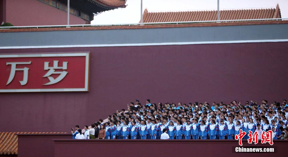 6月1日,众多来自北京市区的学生登上天安门观礼台,观看升旗仪式。中新社发 杨可佳 摄