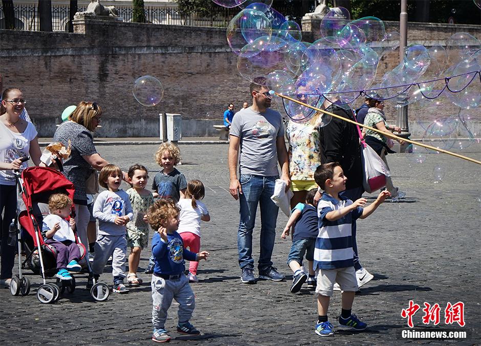 图为世博园外,一群小朋友被气泡吸引。 中新网记者 李卿 摄