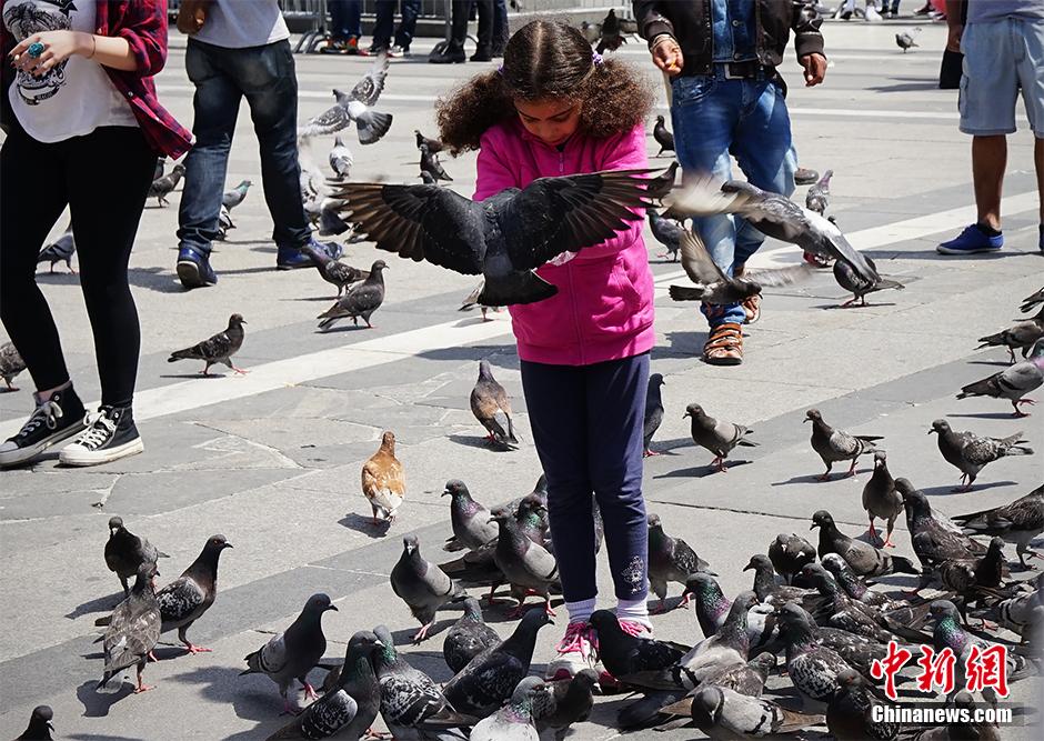 图为一个小朋友跟鸽子一起玩耍。 中新网记者 李卿 摄