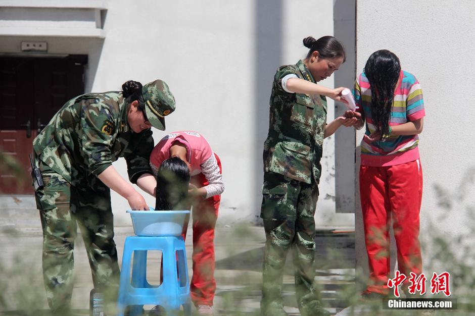 随着“六一”国际儿童节的到来,驻守在“4·25”地震重灾区的西藏公安边防总队吉隆边防检查站组织驻地吉隆镇完小24名困难儿童走进警营,开展了“手牵手?心连心?灾区六一别样情”主题活动。活动当天,这个站为24名困难儿童送上了衣服、文具等礼物,组织他们观看了擒敌拳、擒敌配套术等军事科目,还带他们参观了部队内务设置、警营文化建设,并一同做游戏、踢足球,让灾区儿童度过了一个特殊而有意义的儿童节。图为5月31日,藏公安边防总队吉隆边防检查站的官兵们给孩子们洗头发。 胡俊浩 摄