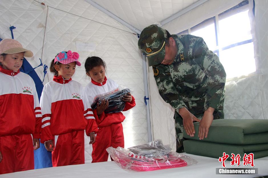 图为5月31日,西藏公安边防总队吉隆边防检查站官兵教灾区儿童叠被子。 胡俊浩 摄