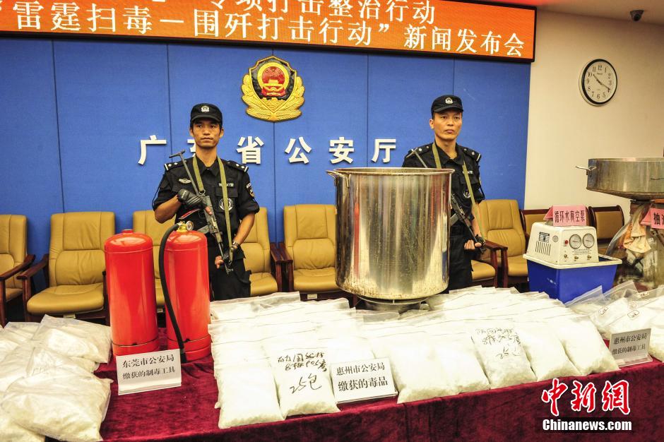 5月28日,广东省公安厅内展示的涉案物品。据广东省公安厅通报,“雷霆扫毒——围歼打击行动”自去年9月开展以来,全省共查处涉陆丰、惠来毒品案件1334宗,抓获嫌疑人1564名,捣毁涉陆丰、惠来制毒工场61个,缴获冰毒6吨,抓获涉毒犯罪逃犯211名。 中新社发 陈骥旻 摄