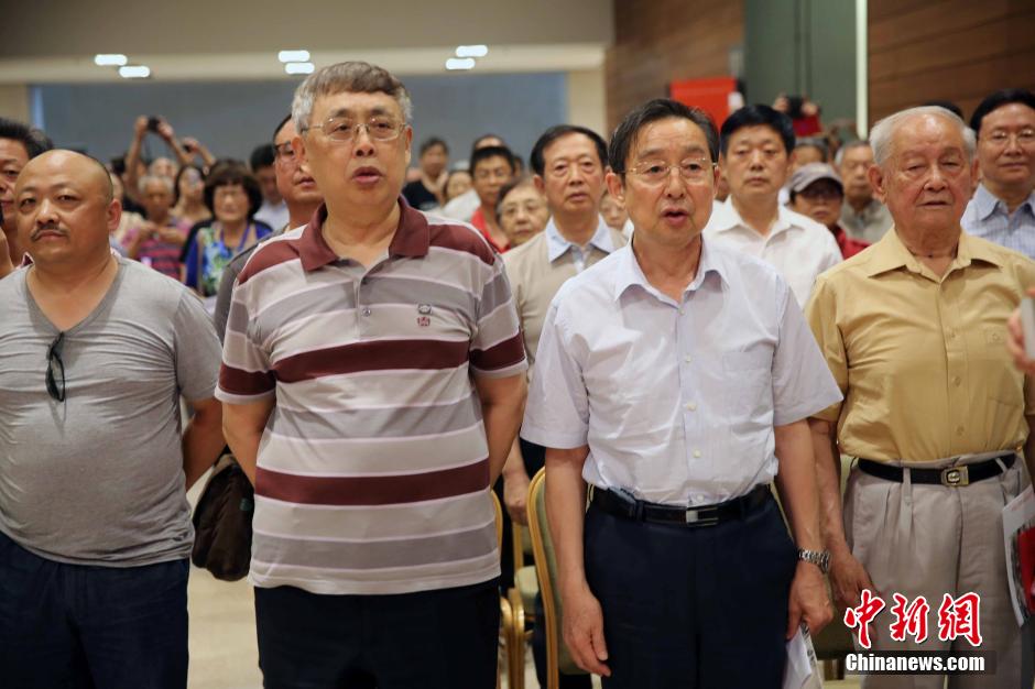 图为陈毅元帅之子陈昊苏(左二)、新四军高级指挥员彭雪枫之子彭小枫上将(右二)等出席活动并高唱新四军军歌。 中新社发 任海霞 摄