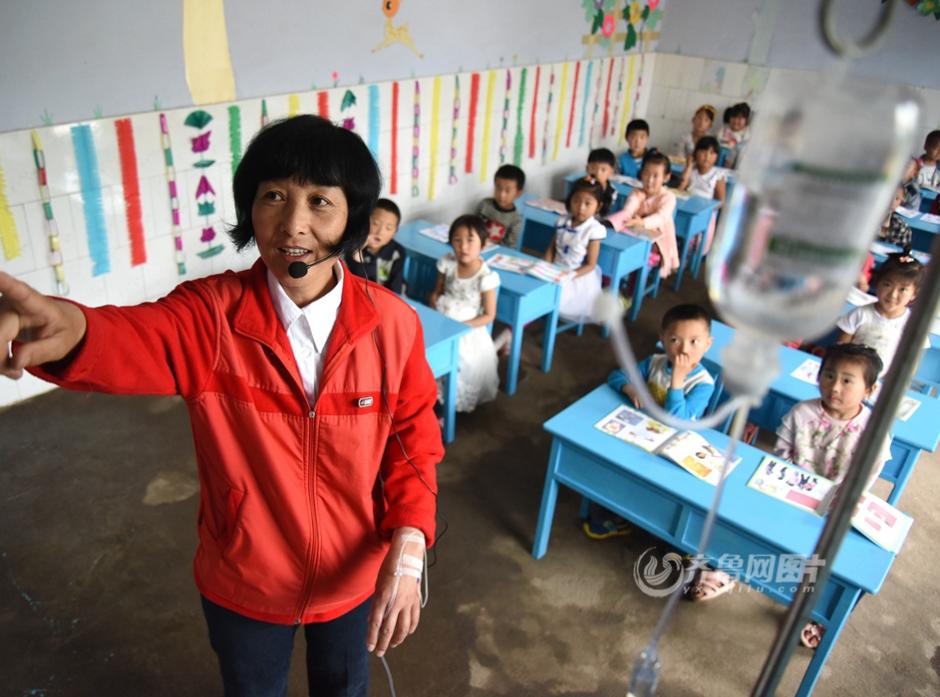 据齐鲁网5月28日报道,山东省沂南县岸堤镇梁家北村幼儿教师李霞身患癌症,一年有300多天在教室输液支撑生命,在三尺讲台上与病魔顽强抗争。1992年,在广州打工的李霞回到家乡办起全县首家民办幼儿园“北村幼儿园”。村边一条小河经常因为大雨暴涨,阻断孩子们上学。2007年,李霞把丈夫打工赚来的钱拿出来,筹资8万多元,在河上建起了两座小桥。图为幼儿教师李霞挂着吊瓶,给孩子们上课。齐鲁网发 杜昱葆 摄 图片来源:齐鲁网