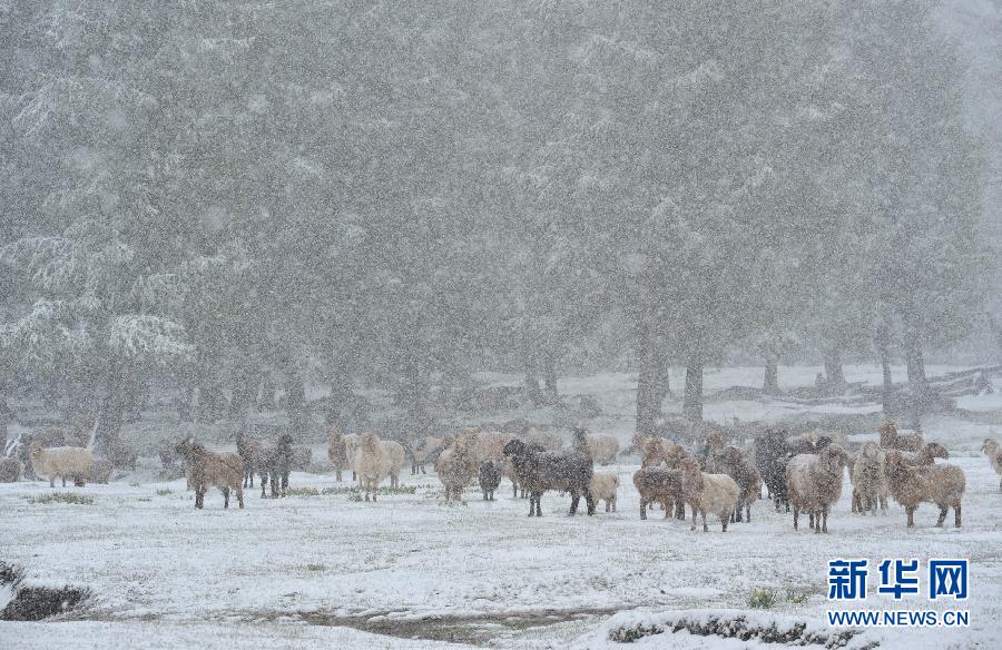 6月2日,在新疆哈密巴里坤草原,羊群在雪中松林下觅食。当日,新疆哈密北部巴里坤草原出现降雪,皑皑白雪覆盖了翠绿的草原和松林,营造出一幅冬夏交错的奇特景象。 新华社发(张建刚 摄)