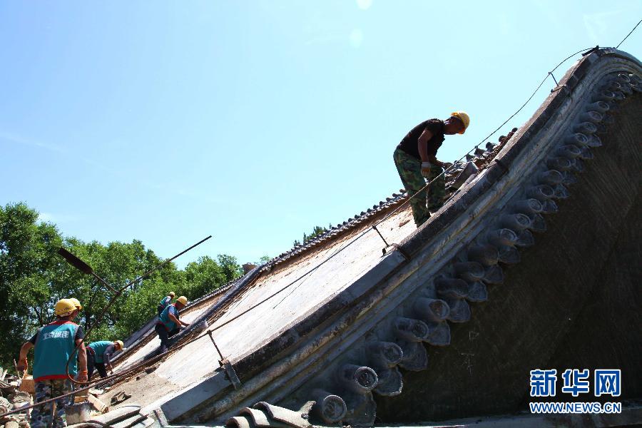 6月3日,工人在河北承德避暑山庄宫殿区一处古建房顶更换新瓦片。目前,世界文化遗产——河北承德避暑山庄的文物修缮工程进展顺利。今年开展的修缮工程主要是对避暑山庄正宫外午朝房、钟楼、双湖夹镜牌楼等15处古建筑景亭的瓦面、墙体、油饰、木构件等进行修缮,预计于今年10月底完工。新华社发(刘环宇 摄)