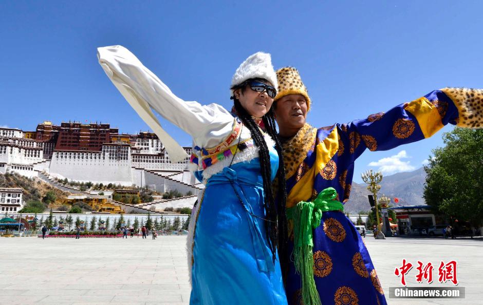6月3日,身着藏装的内地游客在布达拉宫广场合影留念。随着暑期临近,国内外游客在拉萨街头随处可见,尽享高原古城的独特魅力。 中新社发 李林 摄