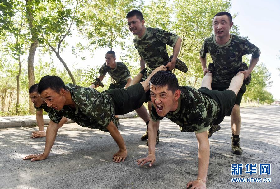 6月6日,学员在进行手推车俯卧撑训练。 6月6日,来自公安边防部队乌鲁木齐指挥学校上百名即将毕业的大学生警官,奔赴天山脚下的陌生地域,开展为期5天的“砺练2015”野外驻训。驻训行动根据新疆公安边防的特点,按实战要求设立课程,全面检验毕业学员实战应用能力,在毕业学员进岗位前“再淬一把火”。新华社记者 赵戈 摄