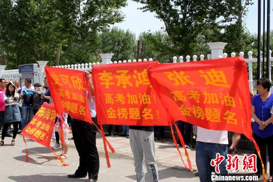家长在考场外打条幅祝福考生。 石峥 摄
