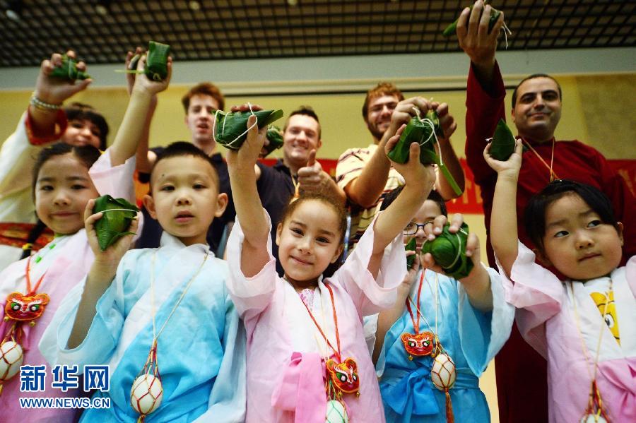 6月10日,外国小朋友和中国小朋友一起展示刚刚包好的粽子。在中国传统节日端午节即将到来之际,江苏省扬州市石塔社区举行“粽香飘千家,真情传万里”外国家庭学习俗过端午活动,邀请外国家庭来到扬州大学第二幼儿园,和中国小朋友一起包粽子,感受传统节日的文化韵味。新华社发(孟德龙 摄)