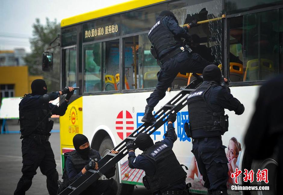 6月17日,乌鲁木齐市公交系统举行反恐反劫持演练,该市特警、消防、医疗救护等相关部分参与其中。演练现场,持刀“歹徒”在公交车站砍伤民众,并劫持人质藏身于公交车上与警方对峙。特警赶到后找准时机,利用器械破窗而入将“歹徒”控制,并解救人质。医疗救护部分对现场伤员进行救治,消防部门扑灭着火车体。刘新 摄