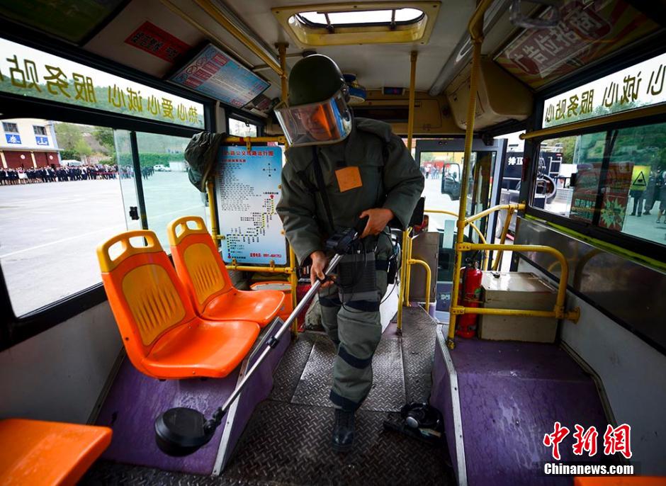 特警队员着防爆服上车搜索爆炸物。刘新 摄