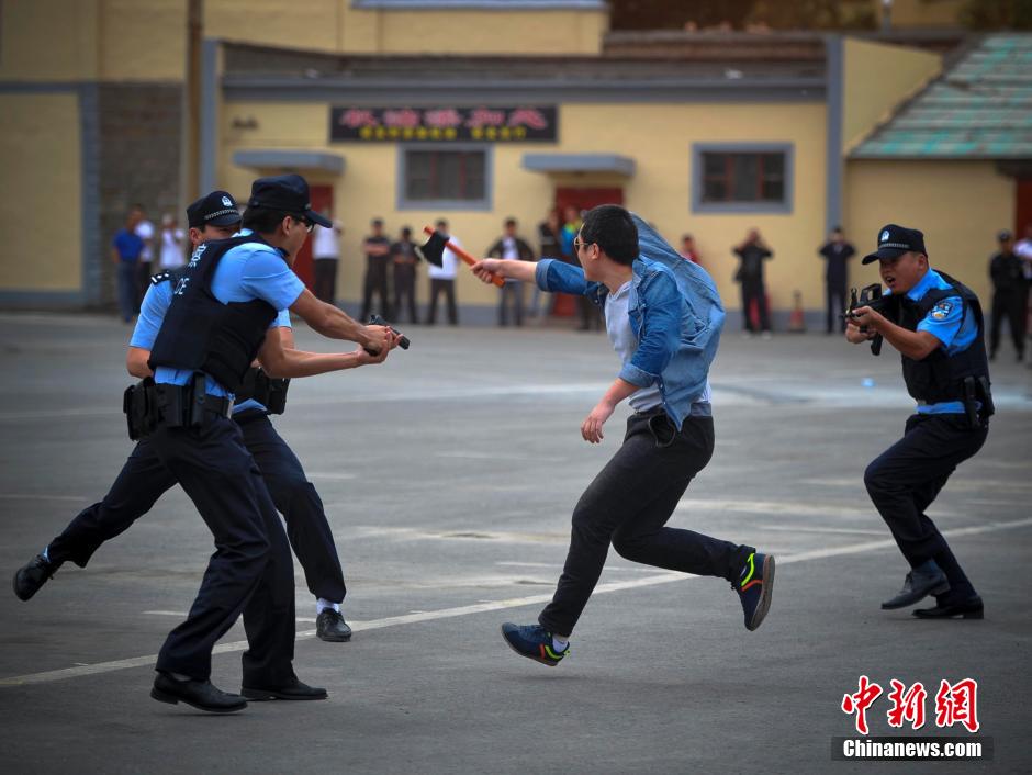 一名“歹徒”挥舞着斧头与警察对峙。刘新 摄
