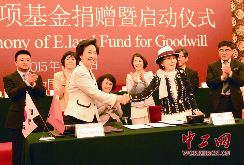 中国残疾人福利基金会理事长王乃坤理事长和依恋集团朴圣敬副会长签署衣恋集善专项基金捐赠协议。 中工网通讯员 若愚 摄