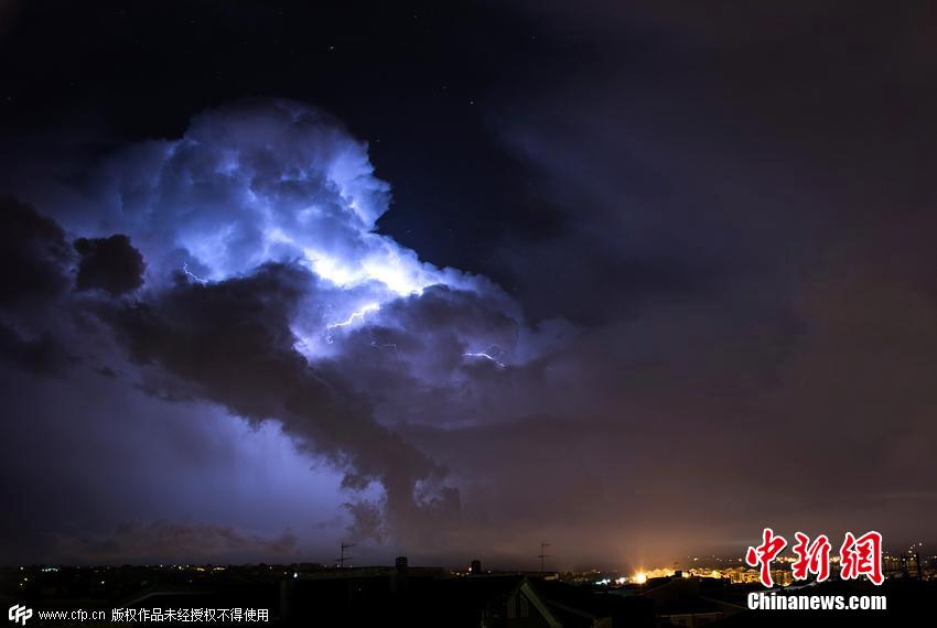 当地时间2015年6月16日,意大利撒丁区,26岁的Daniele Macis冒着生命危险,站在自家屋顶上,用镜头捕捉到闪电划破夜空的自然景象。