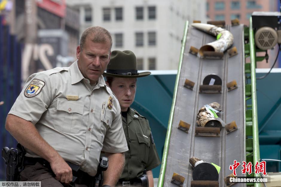 当地时间2015年6月19日,美国纽约,美国鱼类与野生动物管理局在时报广场公开销毁约一吨被美执法部门罚没的非法象牙制品。美国是世界上最大的象牙市场之一,此次公开销毁非法象牙制品旨在向公众和国际社会显示美国打击大象盗猎和抵制非法象牙贸易的决心。