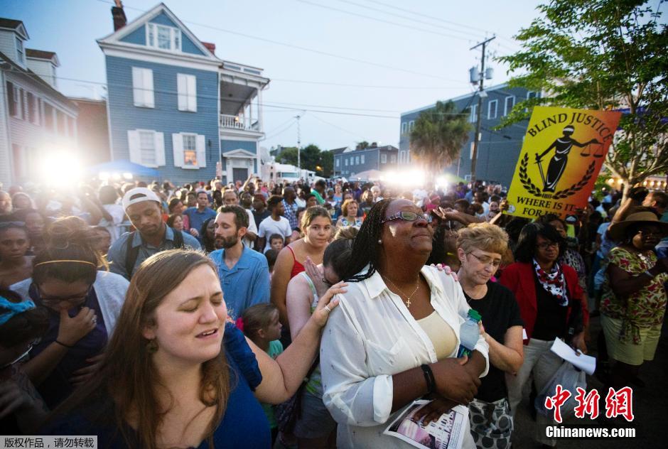 当地时间2015年6月19日,美国南卡罗来纳州,美国民众前往查尔斯顿发生枪击事件的教堂参加悼念教堂枪击案遇难者的活动。