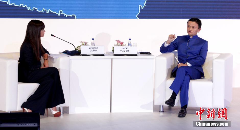 6月19日,中国电商企业——阿里巴巴集团董事会主席马云在圣彼得堡经济论坛上与主持人进行对话。中新社发 王修君 摄