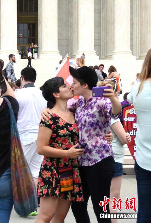 当地时间6月26日,美国最高法院做出历史性裁决,认定同性婚姻受宪法保护。这意味同性伴侣今后可在全美50个州注册结婚。美国总统奥巴马当天表示,这一裁决是美国的胜利。图为同性伴侣及支持者在美最高法门前举行庆祝活动。中新社发 刁海洋 摄