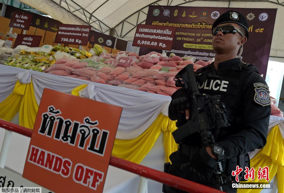 当地时间2015年6月26日,泰国Ayutthaya,泰国军事人员检查没收的毒品。泰国将销毁重达9000公斤的毒品,总价值高达5亿8800万美元。