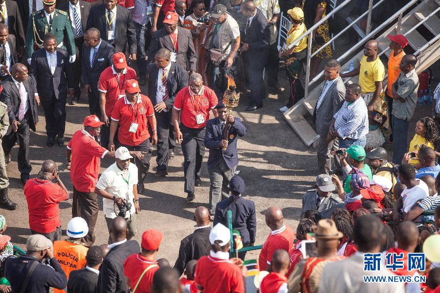 6月25日,在莫桑比克首都马普托,象征国家独立和民族团结的火炬到达莫桑比克独立40周年庆典现场。火炬接力从莫桑比克北部开始,经全境到达位于南部的首都马普托。莫桑比克在1975年6月25日宣布独立,脱离葡萄牙殖民统治。 新华社发 莫罗 摄 图片来源:新华网