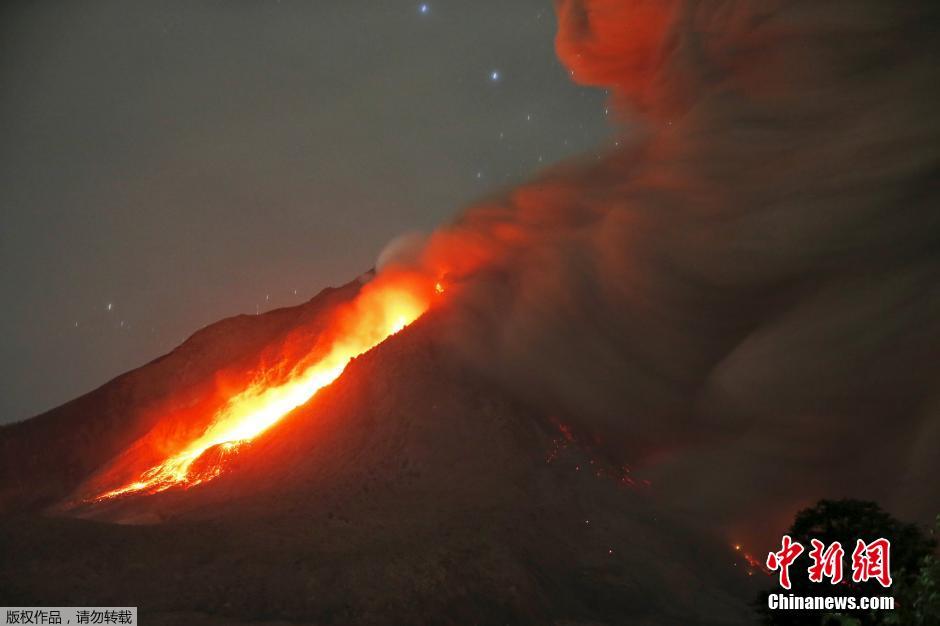 当地时间2015年6月26日,印尼卡洛,印尼锡纳朋火山持续喷发,火红岩浆倾泻而出,周边村落上万民众紧急撤离。