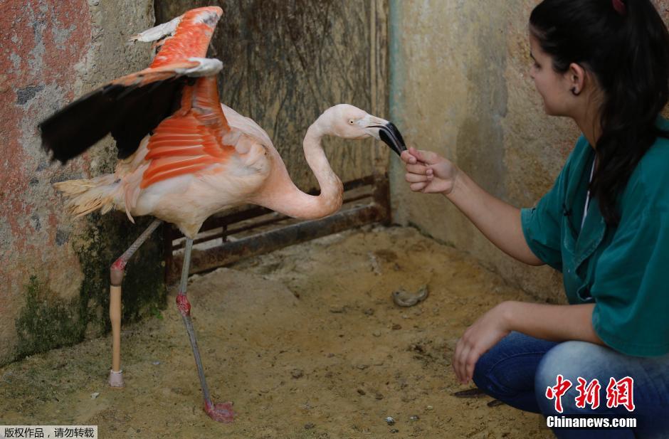 图为安装了假肢的火烈鸟与兽医玩耍。